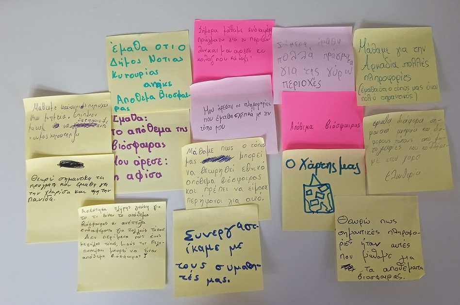 Συγκεκριμένα, στις 22 Μαίου 2025 εμψυχώσαμε βιωματικό εκπαιδευτικό πρόγραμμα διάρκειας 2 σχολικών ωρών, αφιερωμένο στο υποψήφιο απόθεμα στην Ε’ και ΣΤ’ τάξη του Δημοτικού Σχολείου Λεωνιδίου καθώς και στην Α΄Γυμνασίου Λεωνιδίου (συνολικά 60 μαθητές/τριες). Κατά τη διάρκεια των πιλοτικών αυτών παρεμβάσεων τα παιδιά, μέσα από δημιουργικές δραστηριότητες ανακάλυψαν πώς συν-διαμορφώνεται η αντίληψη του εαυτού τους και από τον τόπο που μεγαλώνουν (από το τοπικό τους περιβάλλον, τον πολιτισμό, τις παραδόσεις), για το πώς συνδεόμαστε με τον τόπο/ περιβάλλον όπου ζούμε, και τονίσαμε ότι η κατανόηση της σύνδεσής μας με τον τόπο μας, μας βοηθά να γίνουμε καλύτεροι διαχειριστές του περιβάλλοντός μας. Επίσης, “γνώρισαν” ανακαλυπτικά το υποψήφιο απόθεμα βιόσφαιρας , τις 3 ζώνες του, τα περιβαλλοντικά και ανθρωπογενή μνημεία που περιλαμβάνει.